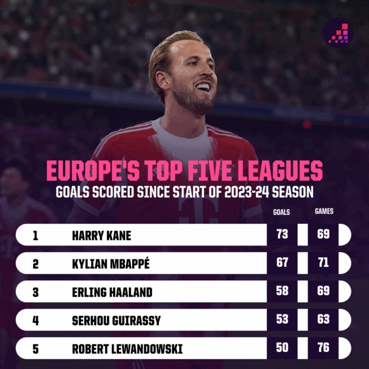 23-24赛季以来五大职业联赛 射手榜:凯恩73球居首,姆