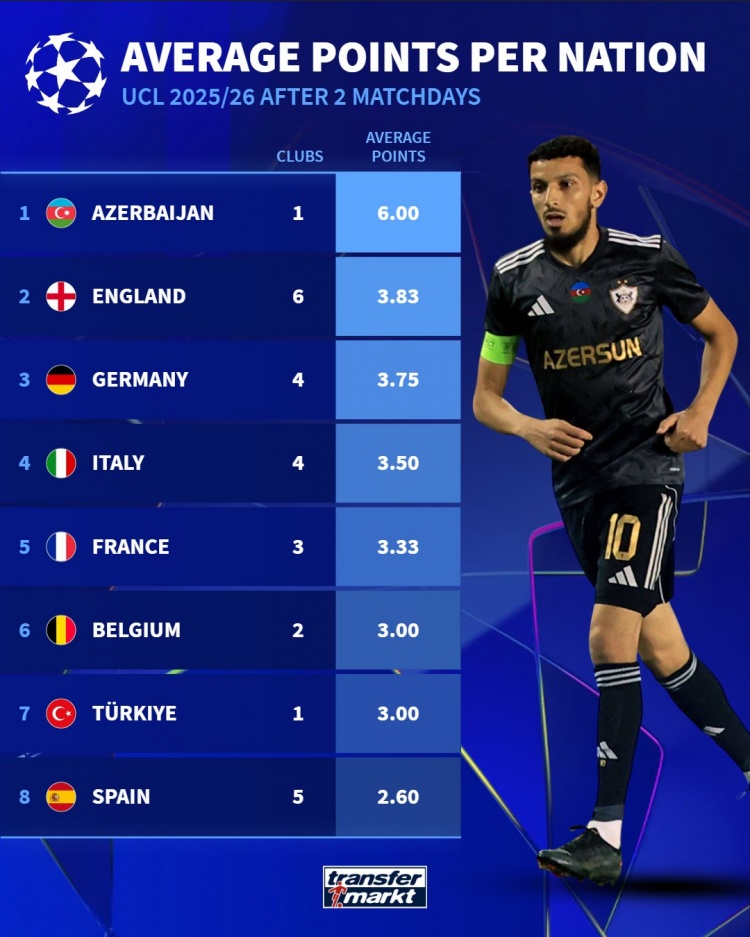 10月2日讯 欧冠第二轮赛事 战罢,德国转会市场统计了各国球队两轮过后的平均积分,阿塞拜疆6分最高,苏超在线直播高清视频无插件英格兰3.83分,德国3.75分。