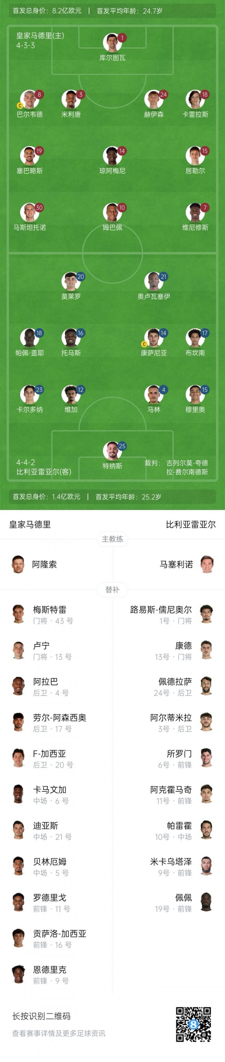 皇马杆位:1-库尔图瓦、8-巴尔韦德、3-米利唐、24-赫伊森、18-卡雷拉斯、14-琼阿梅尼、19-塞巴略斯、30-马斯坦托诺、15-居勒尔、7-维尼修斯、10-姆巴佩