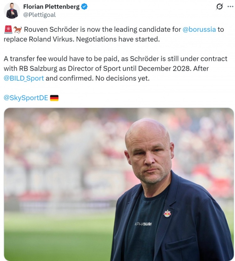 施罗德目前担任萨尔茨堡红牛总监,他的合同2028年12月到期葡萄牙足球超级联赛,因此门兴需要为他支付转会费(补偿金),目前各方尚未做出最终决定。