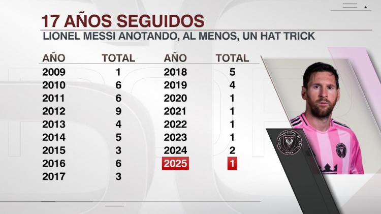 梅西连续17年戴帽: