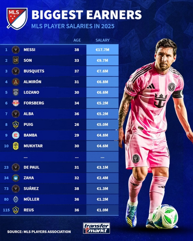 10月31日讯 德国转会市场统计了美职联球员的薪资,并列出榜单,苏超直播在线观看梅西1770万欧断层居首,孙兴慜970万欧次席。