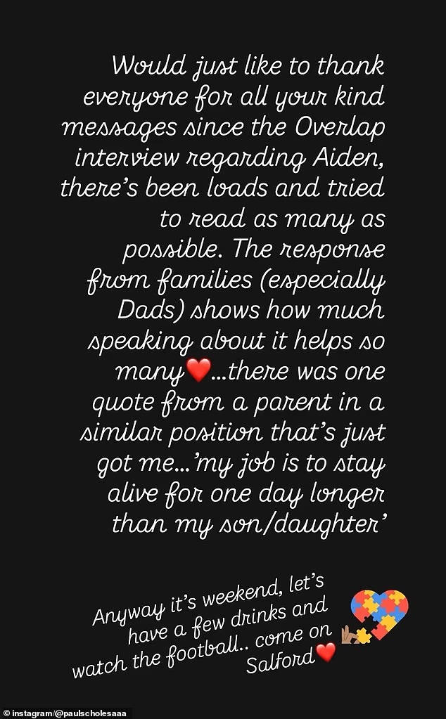 11月02日讯 据《每日邮报》报道,前曼联和英格兰传奇球星保罗·斯科尔斯的女儿艾丽西亚·斯科尔斯在父亲发表了感人至深的关于照顾自闭症儿子的播客节目后,向这位慈爱的父亲表达了衷心的敬意。