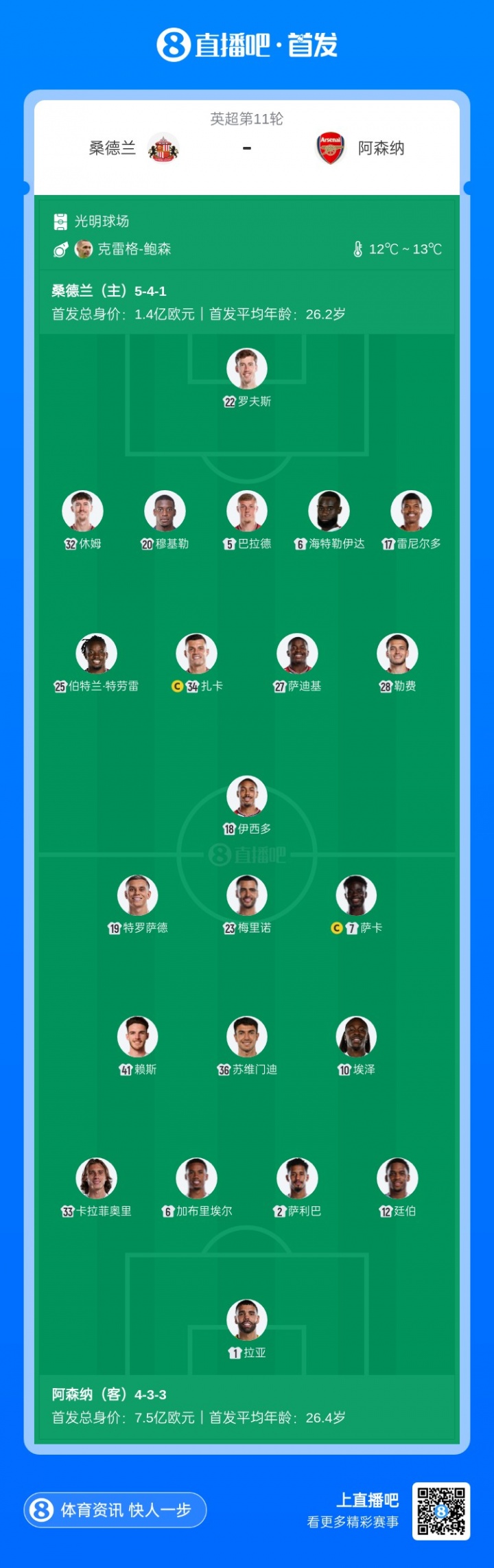 阿森纳杆位:1-拉亚、2-萨利巴、6-加布里埃尔、12-廷伯、33-卡拉菲奥里、10-埃泽、23-梅里诺、36-苏维门迪、41-赖斯、7-萨卡、19-特罗萨德