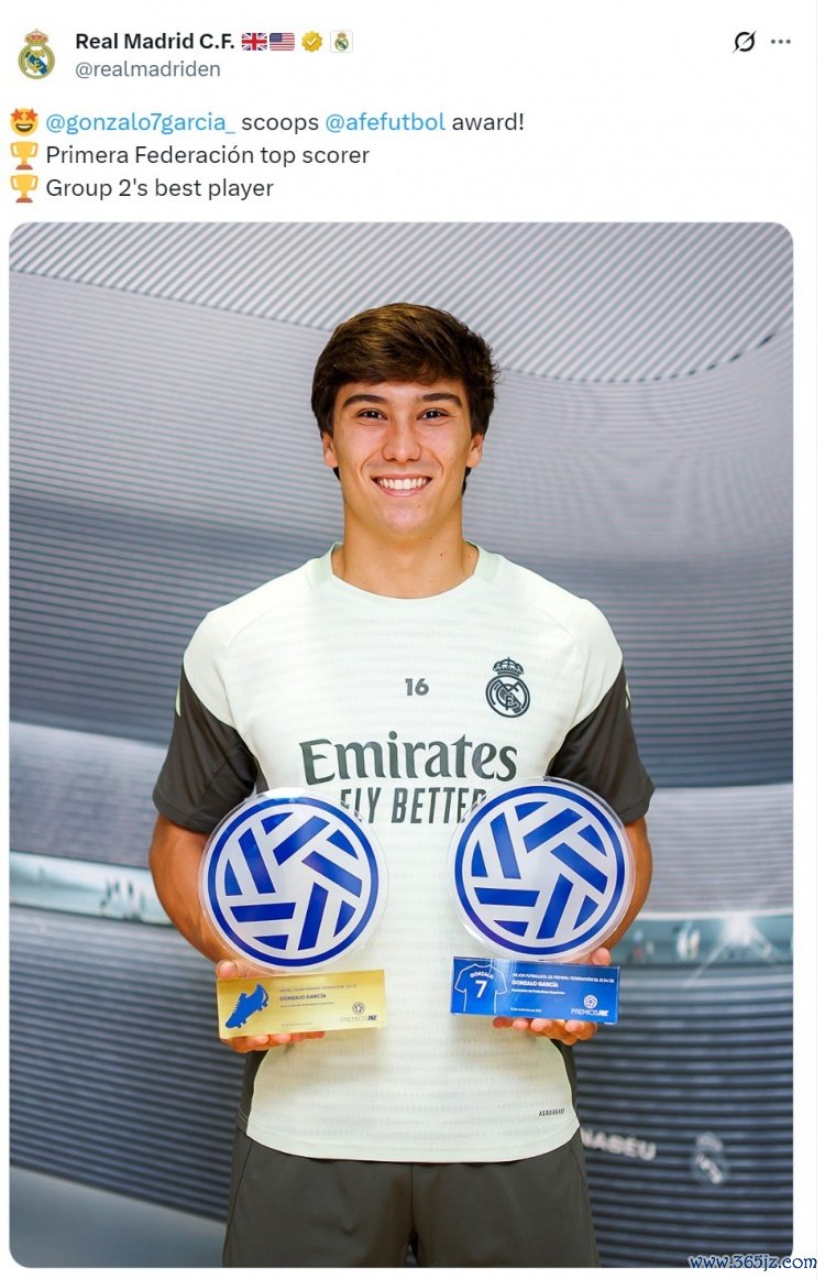 11月11日讯 皇马前场球员贡萨洛·加西亚获得上赛季西协甲两个奖项,皇马官方社媒晒照祝贺。