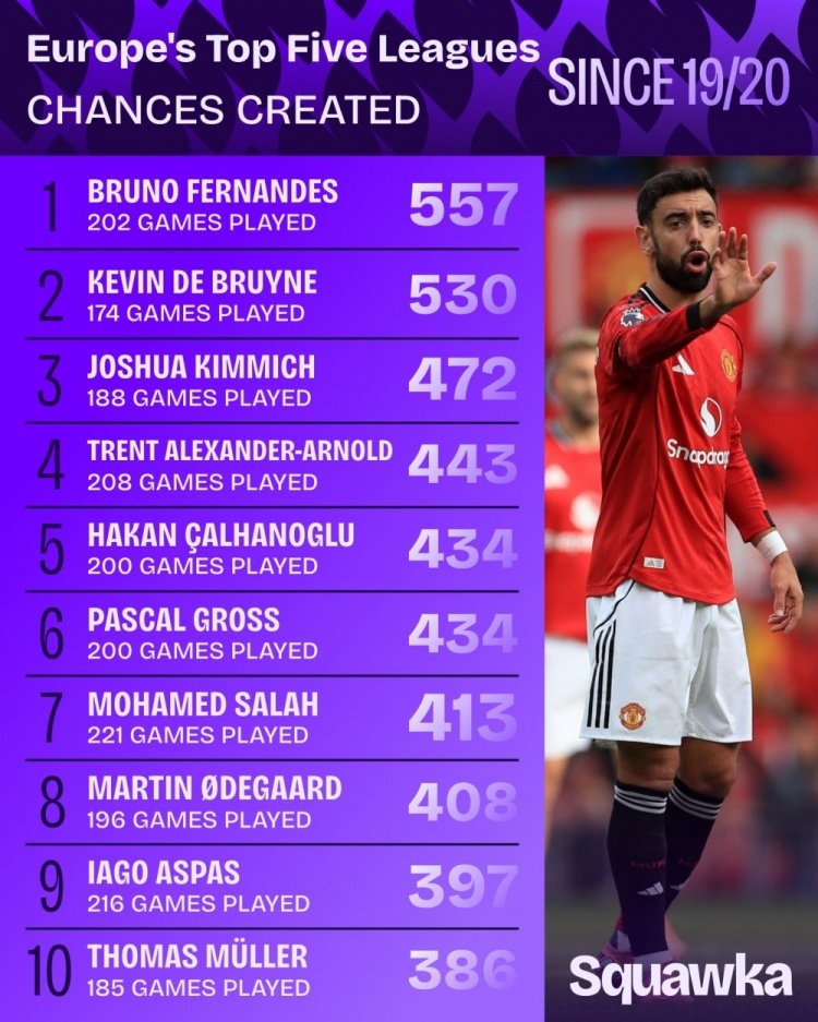 19-20赛季以来五大职业联赛 创造机会榜:B费557次居
