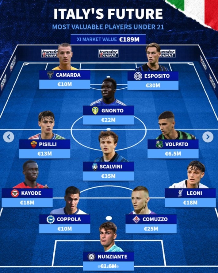 10月12日讯 德转列出意大利U21最贵阵形 ,莱奥尼、皮奥-埃斯波西托在列,11人总身价1.89亿欧。