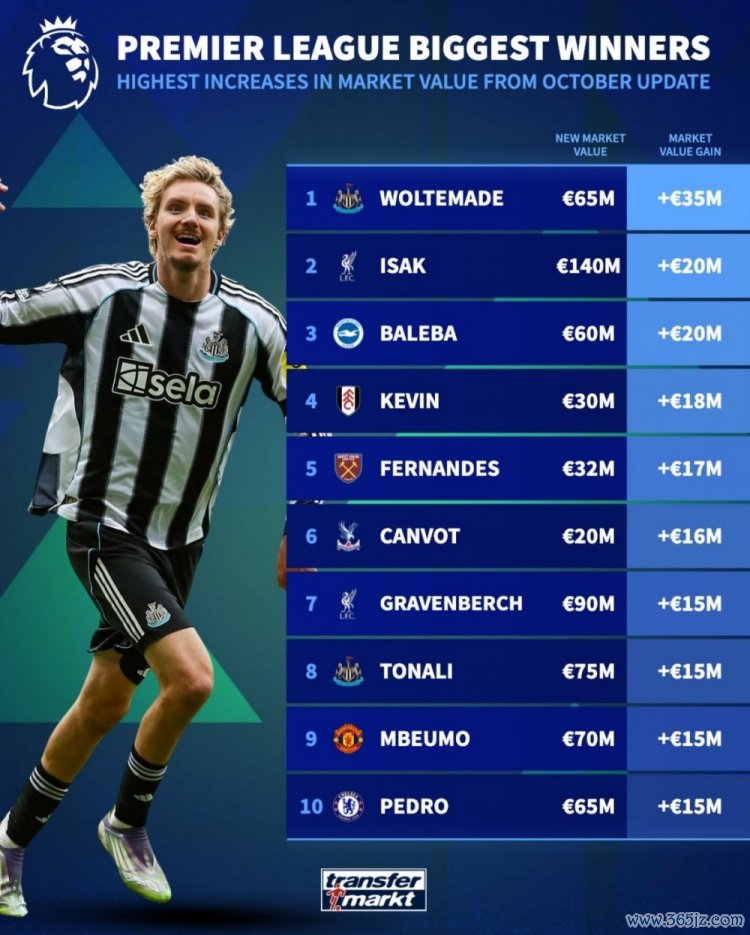 10月17日讯 德转更新了英超球员身价,并盘点了本次身价涨幅最大的10名球员,具体如下(现身价,涨幅):